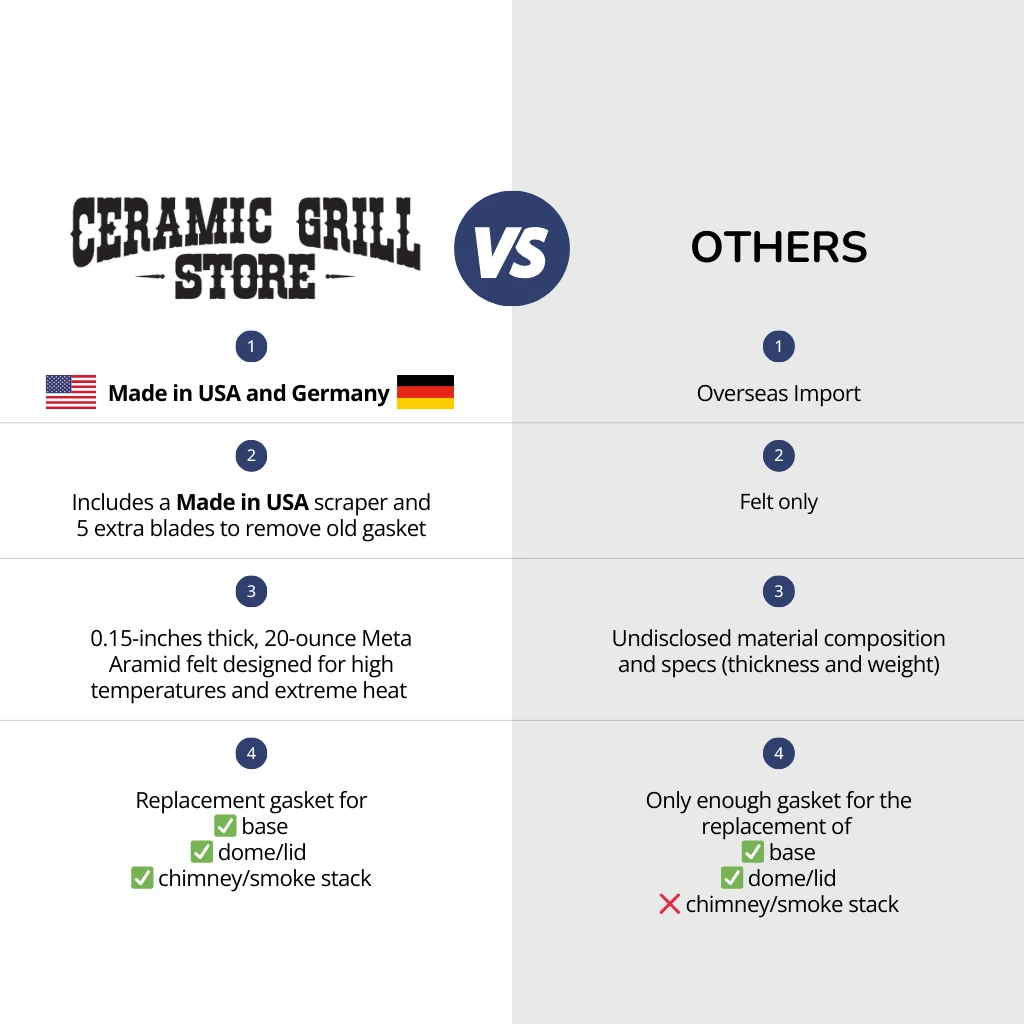 We tell you what others won’t – gasket specs. Our gaskets are engineered from Meta-Aramid materials in the USA and Germany, not China. At a 20 oz. weight, 7/8″ wide and 0.150″ thick, the easy peel and stick gaskets provide lasting durability and superior heat resistance. The gaskets are specifically manufactured for the Big Green EGG kamados.