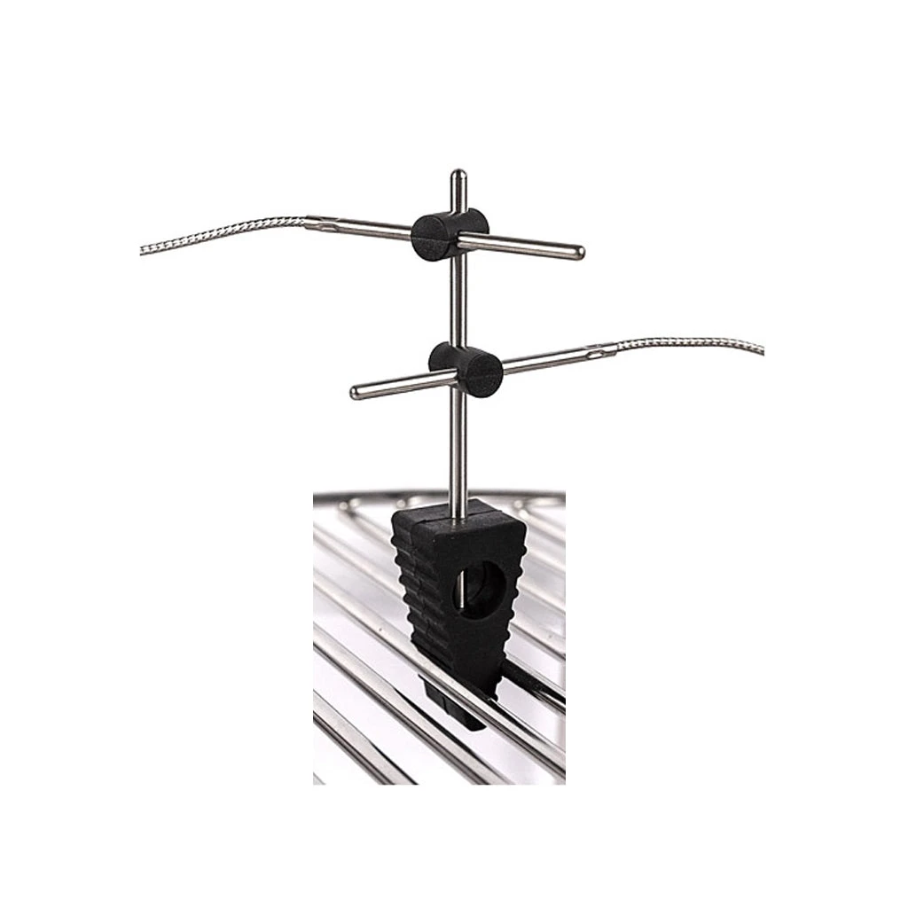 Easy to use – (1) slide the pit probe into one of the two, adjustable probe holders, (2) push the bottom wedge between the grid’s crosswires and (3) adjust the probe height. We see no reason to, but you could attach an Alligator Clip with Pit Probe to the vertical stem.